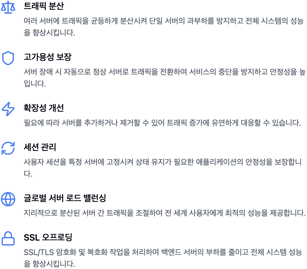 - SSL 종료 기능: SSL 암호화를 로드밸런서에서 처리함으로써 백엔드 서버의 부담을 덜어줄 수 있습니다.
