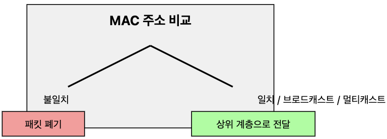 패킷 처리: 패킷의 도착지 MAC 주소가 자신의 MAC 주소와 일치하지 않으면 해당 패킷은 NIC에 의해 폐기됩니다. 도착지 MAC 주소가 자신의 MAC 주소, 브로드캐스트 주소, 혹은 멀티캐스트 주소일 경우에는 패킷을 상위 계층(OS나 애플리케이션)으로 전달하여 처리하게 됩니다.