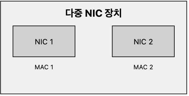 단말은 NIC를 여러 개 가질 수 있으므로 MAC 주소도 여러 개 가질 수 있습니다. 멀티레이어 스위치, 라우터와 같은 복잡한 네트워크 장비는 NIC이 여러 개이고 MAC주소도 여러 개가 할당됩니다.